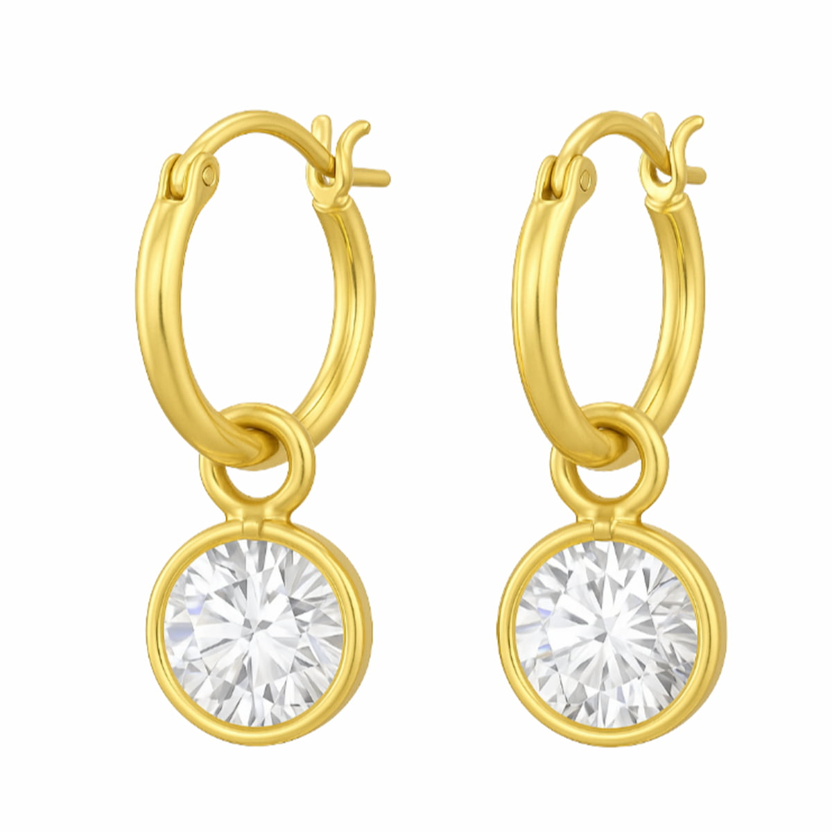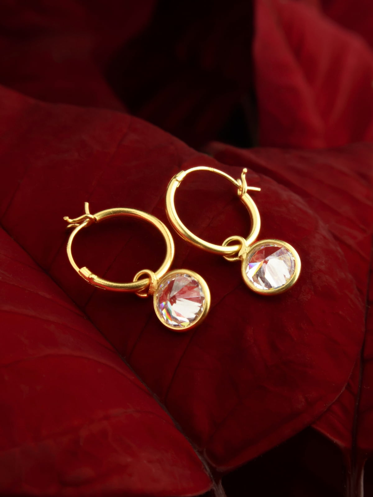 Cercei Mirror din Argint 925 placat cu aur 24k — cercei hoop cu pandantiv rotund și două cristale zirconia