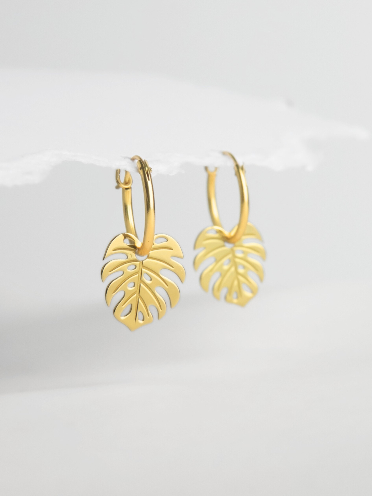 Eleganți, feminini și moderni, cerceii Monstera combină forma fină a hoop-urilor cu un pandantiv organic în formă de frunză Monstera. Realizați din Argint 925 placat cu aur 24k și protejați cu E-coat, sunt perfecți pentru un look natural, stilat și versatil.