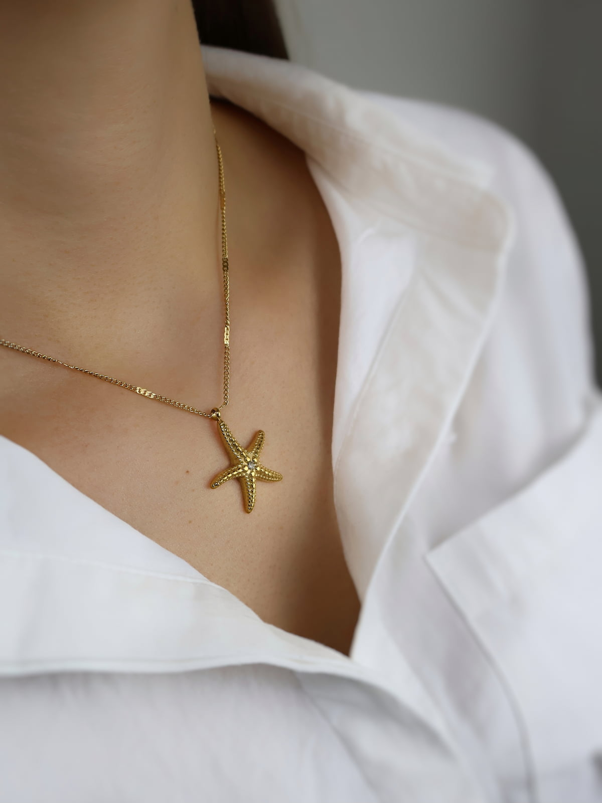 Colier Stea de Mare din oțel inoxidabil 316L placat cu aur 18K — un accesoriu strălucitor și feminin, inspirat de eleganța liniștitoare a mării. Pandantivul în formă de stea de mare, decorat cu un cristal cubic zirconia, aduce un echilibru perfect între naturalețe și rafinament, fiind ideal pentru ținute casual, romantice sau de vacanță.