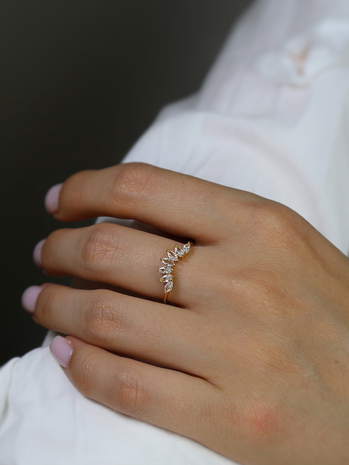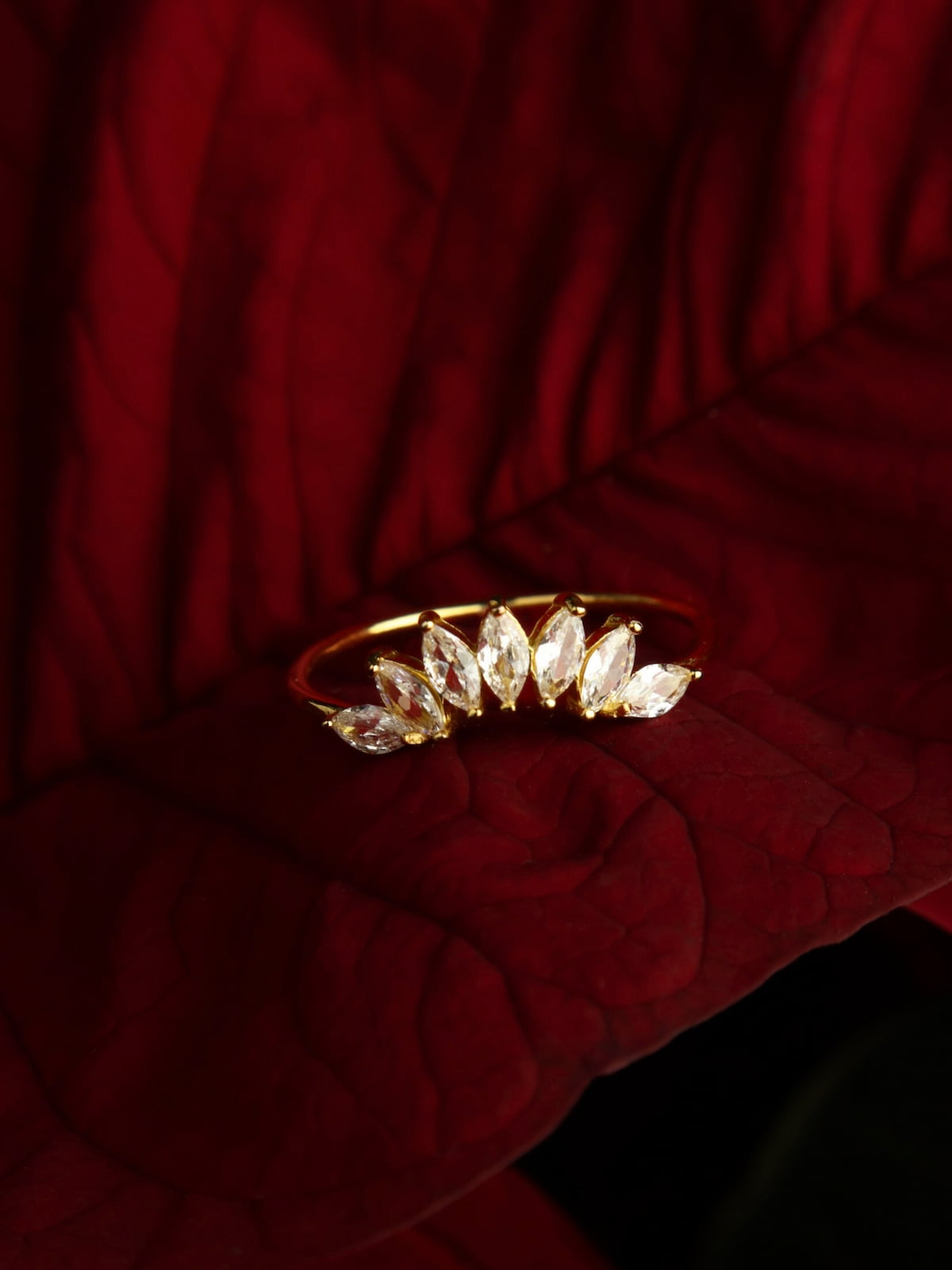 Inel Crown din Argint 925 placat cu aur 24k — un model delicat în formă de coroană, decorat cu 7 cristale zirconia, ce adaugă o notă regală și feminină oricărei ținute.